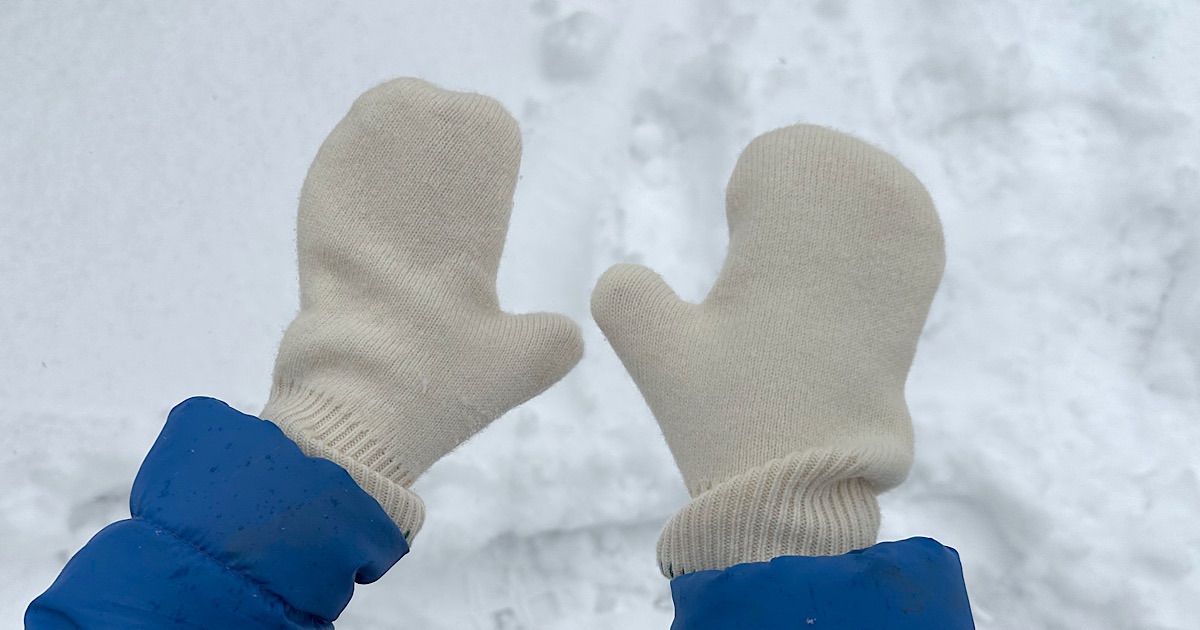 着なくなった大人用のニットセーターをリメイクして、子ども用のミトン手袋を作りました。